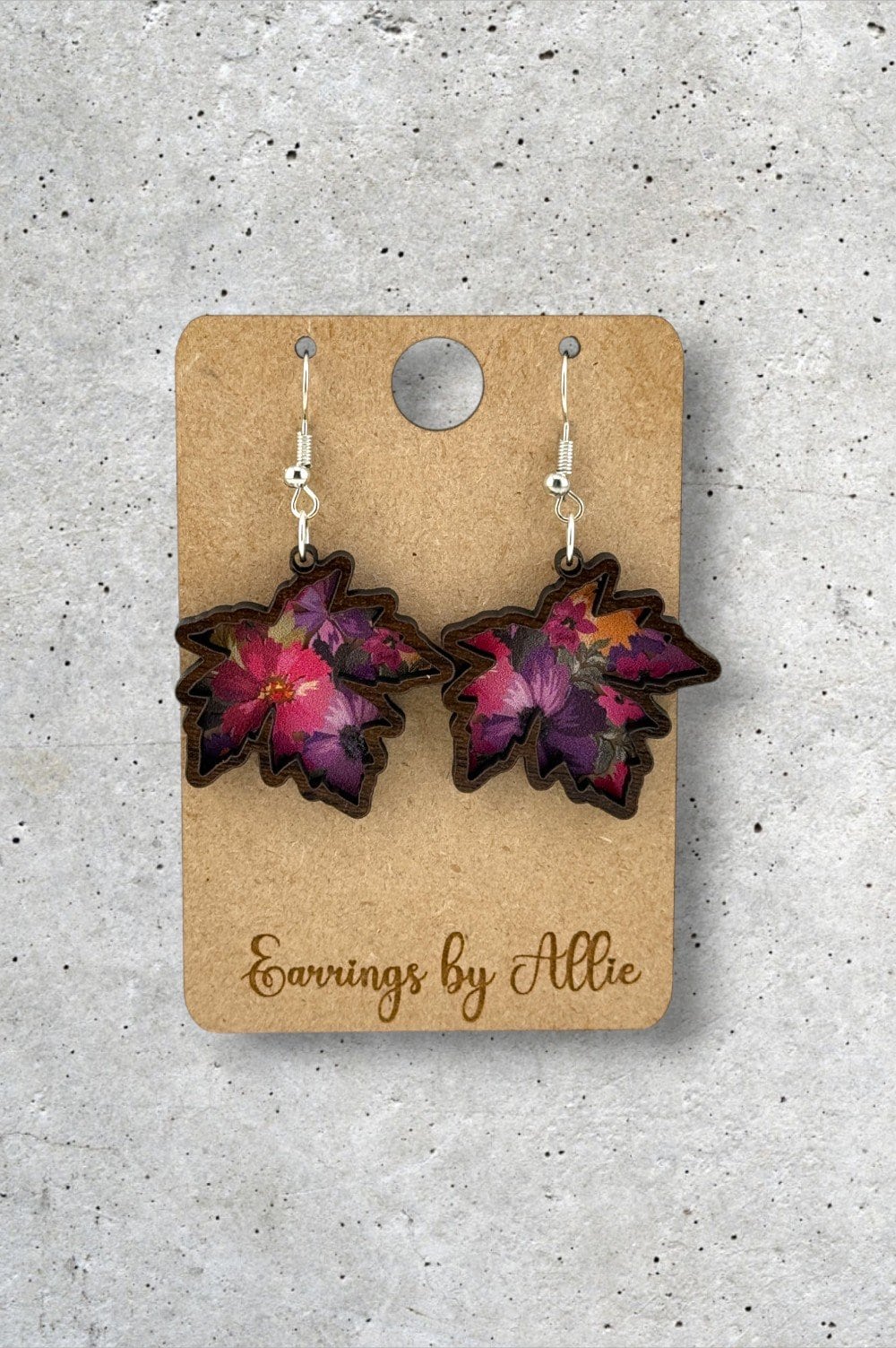Fall Flowers Leaf Dangly Earrings Celebrate cozy season with these handcrafted earrings featuring a charming wooden leaf cutout backed by flexible acrylic for a layered, dimensional look. Lightweight and stylish, they’re finished with hypoallergenic stainless steel hooks perfect for sensitive ears. Available in your choice of gold or silver hardware to match your autumn vibe! 🍂🧡🎃