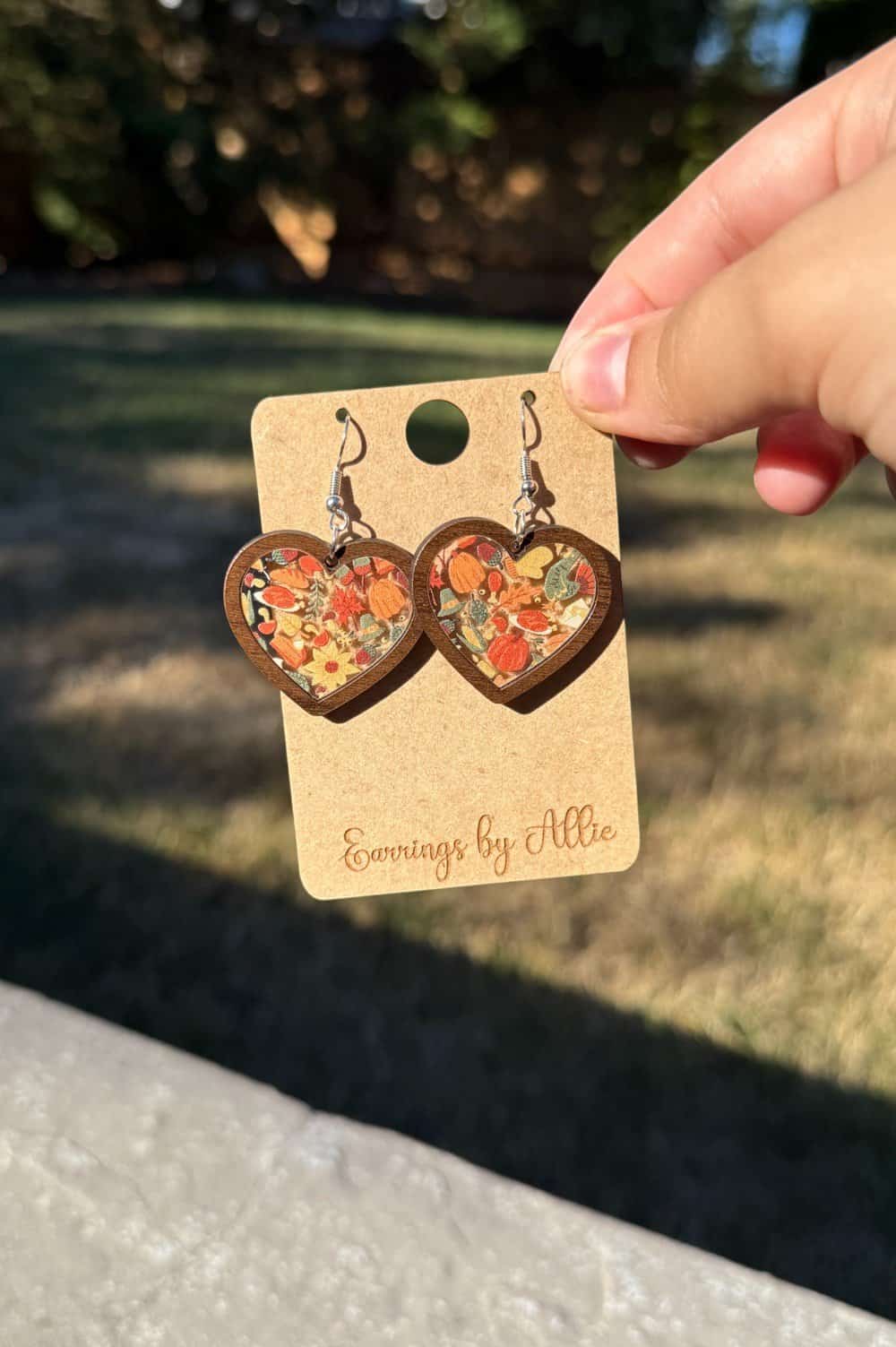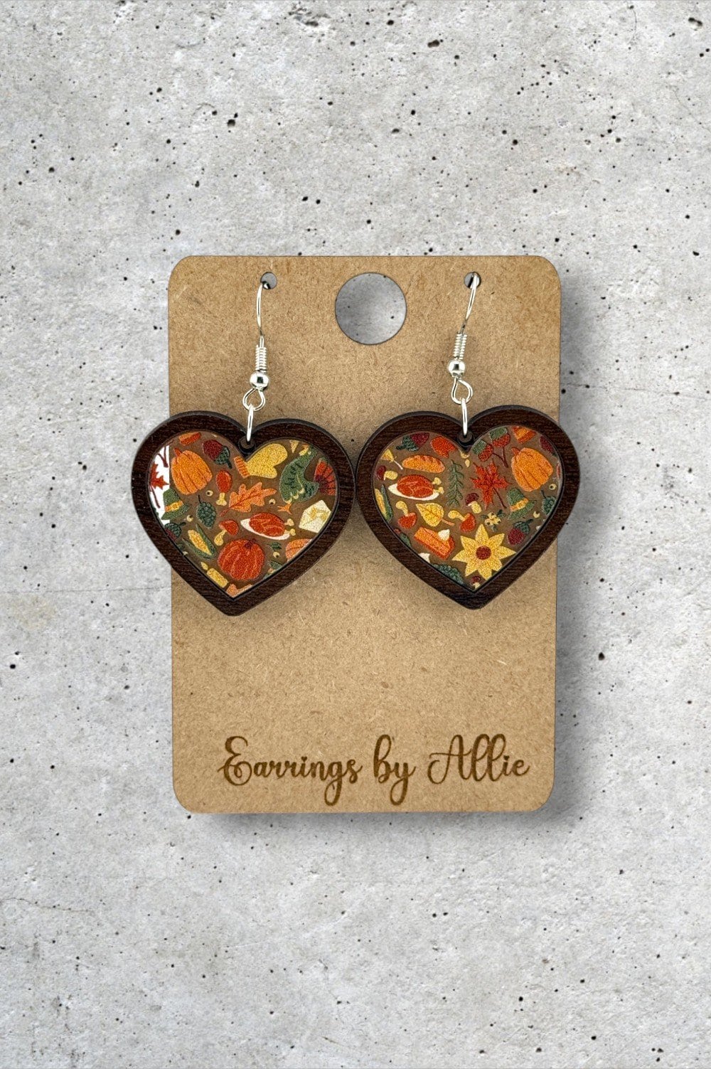 Fall Heart Dangly Earrings Celebrate cozy season with these handcrafted earrings featuring a charming wooden heart cutout with fall patternply acrylic layered inside the cutouts! Lightweight and stylish, they’re finished with hypoallergenic stainless steel hooks perfect for sensitive ears. Available in your choice of gold or silver hardware to match your autumn vibe! 🍂🧡🎃