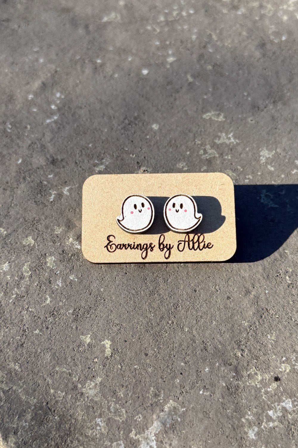 Ghost Buddy Stud Earrings! Celebrate cozy season with these hand-painted ghost stud earrings, crafted on 1/8″ maple wood for a warm, natural finish. Each tiny pumpkin is lovingly detailed by hand, making every pair one-of-a-kind. Lightweight yet sturdy, they’re finished with hypoallergenic stainless steel posts and your choice of gold or silver hardware. Whether you’re sipping cider or strolling through a fall market, these studs add just the right touch of autumn charm! 🍂🧡🎃