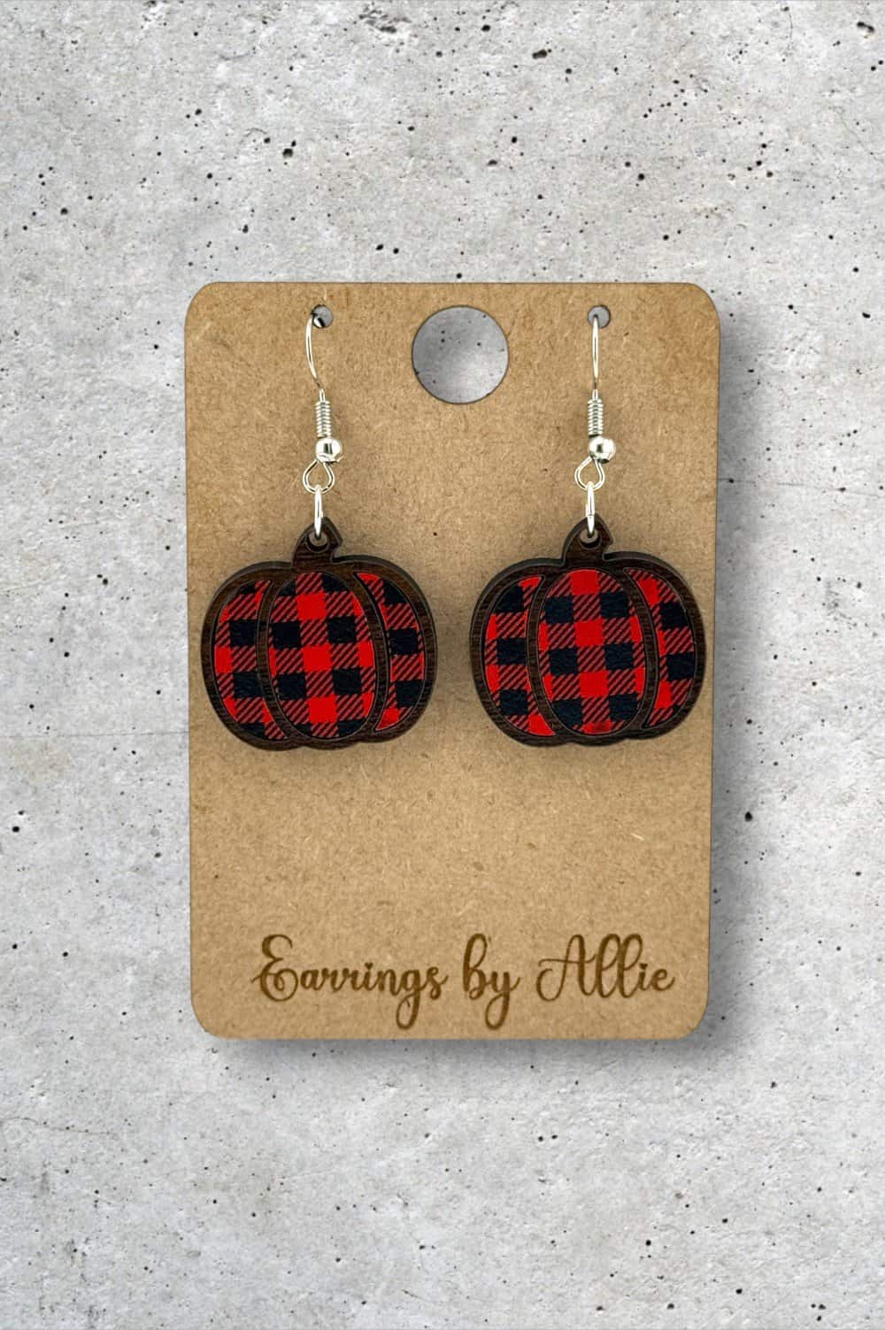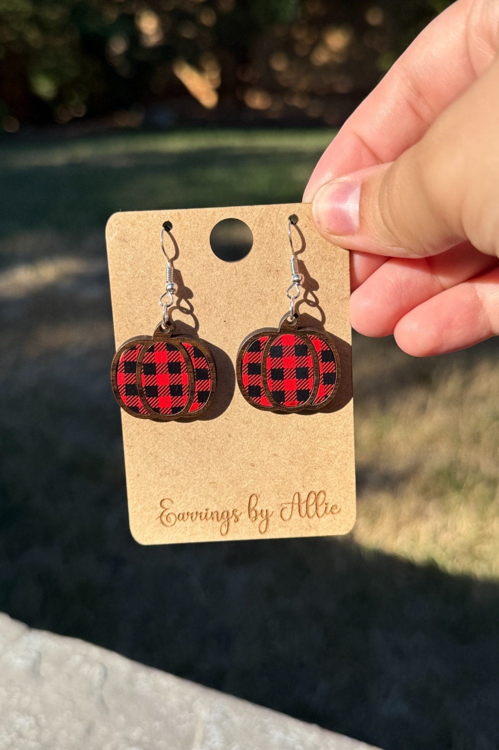 Plaid Pumpkin Dangly Earrings Celebrate cozy season with these handcrafted earrings featuring a charming wooden pumpkin cutout with a plaid patternply layered in the cutout! Lightweight and stylish, they’re finished with hypoallergenic stainless steel hooks perfect for sensitive ears. Available in your choice of gold or silver hardware to match your autumn vibe! 🍂🧡🎃