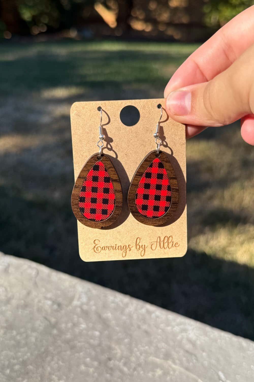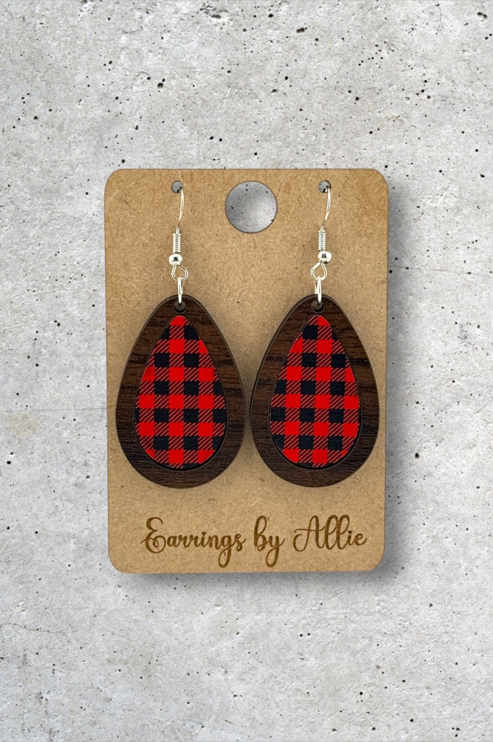Plaid Teardrop Dangly Earrings Celebrate cozy season with these handcrafted earrings featuring a charming wooden teardrop cutout with a plaid patternply layered in the cutout! Lightweight and stylish, they’re finished with hypoallergenic stainless steel hooks perfect for sensitive ears. Available in your choice of gold or silver hardware to match your autumn vibe! 🍂🧡🎃