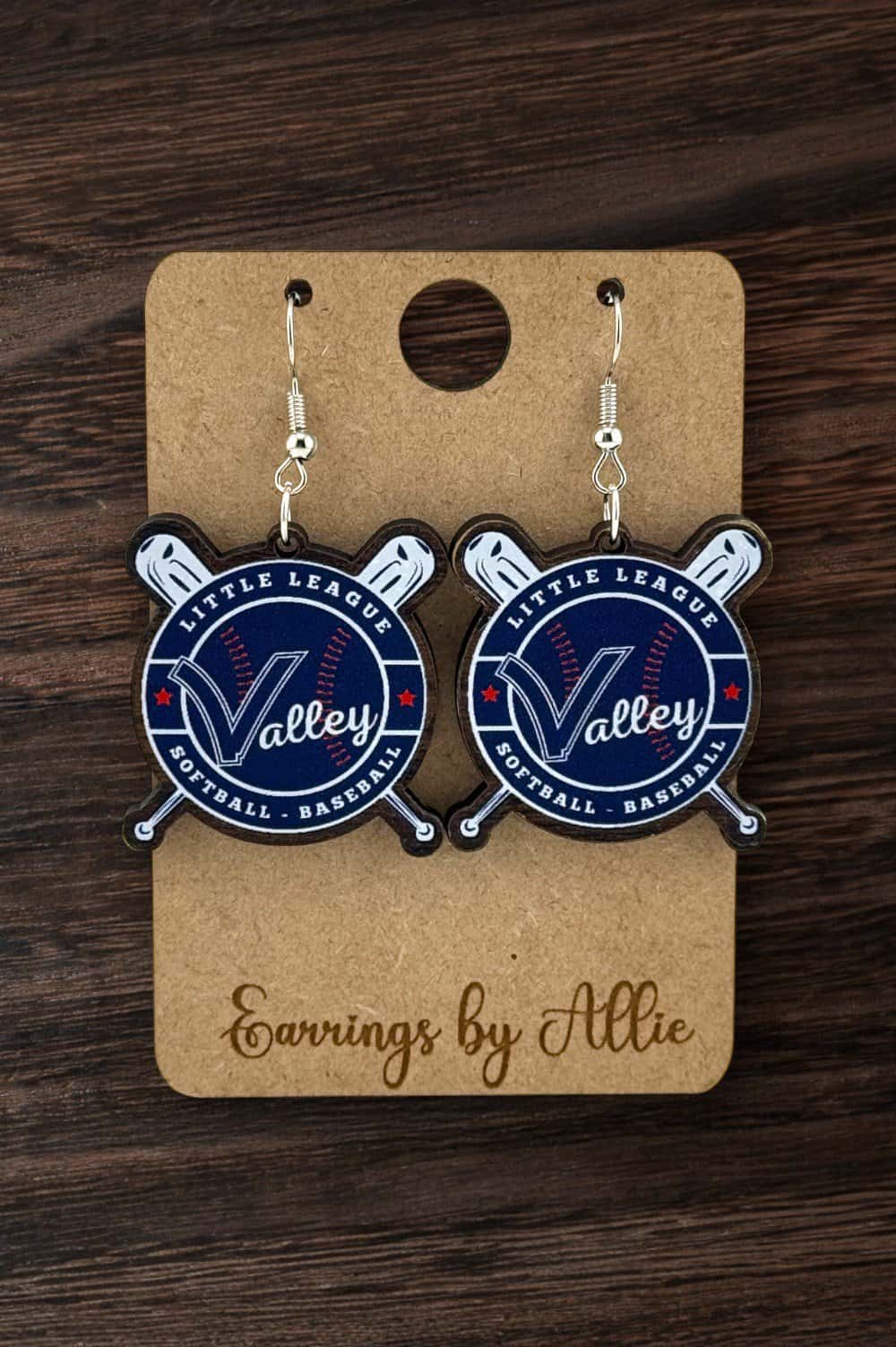 Celebrate the season in style with these handmade wooden earrings, crafted for Valley Little League. Their natural wood finish pairs beautifully with spirit wear, while hypoallergenic stainless-steel hardware ensures comfortable wear all season long. Lightweight and on theme, they’re the perfect accessory for game days!